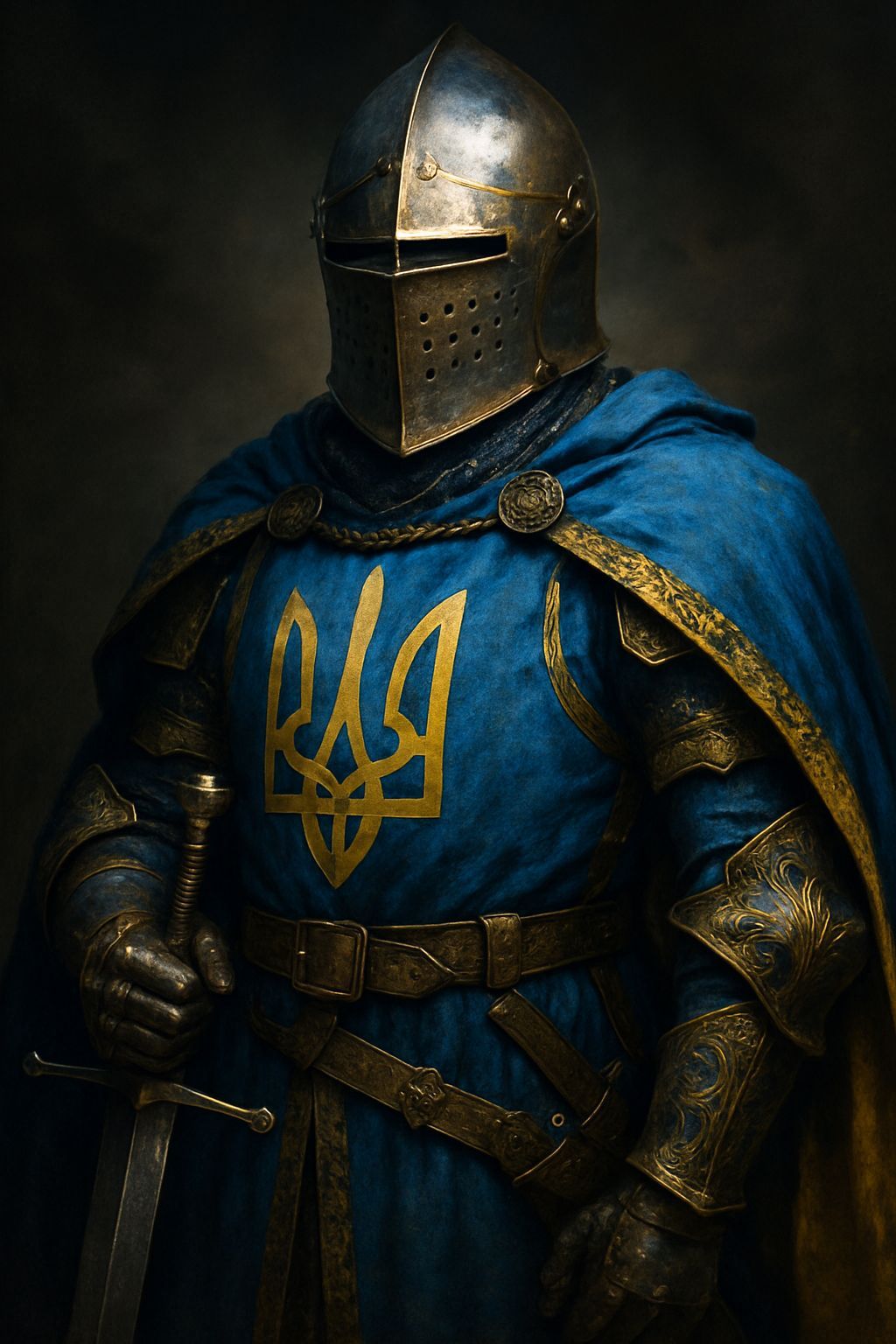 This image shows a knight in Ukrainian colors and heraldry. The highly detailed picture features a cinematic composition and sharp focus, rendered with high contrast to create an atmospheric mood.