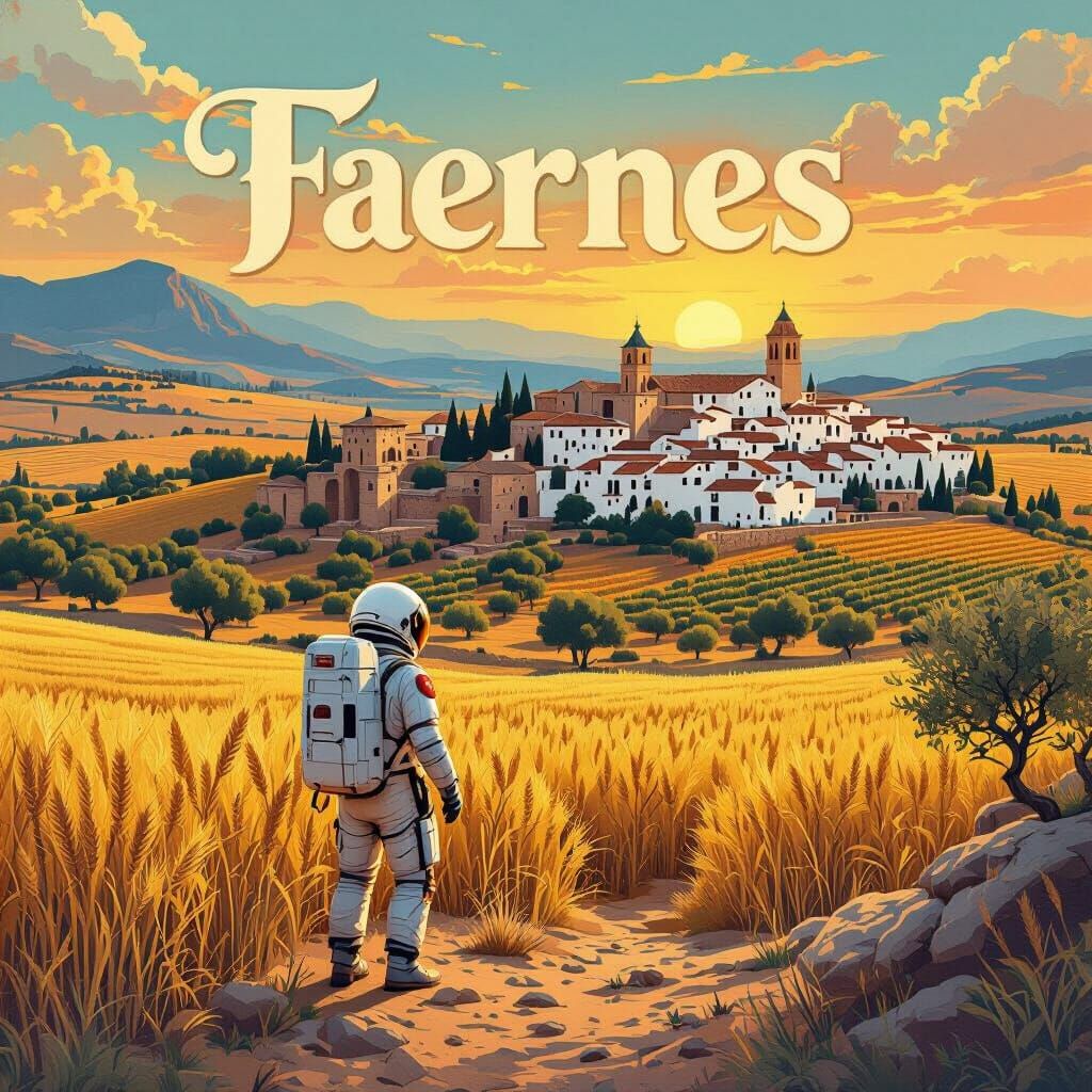 This image shows an astronaut exploring ancient ruins set within a Spanish landscape. The art is styled as a retro movie poster with golden wheat fields, white villages, and warm sunset colors, reminiscent of hand-drawn vintage illustrations.