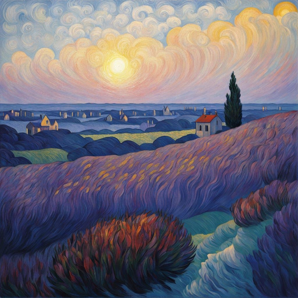 A striking oil painting in a neo-impressionist and expressionist style, featuring a lone figure on luminous clouds. The artwork showcases detailed impasto textures and dramatic lighting with deep indigo, violet, and purple hues.