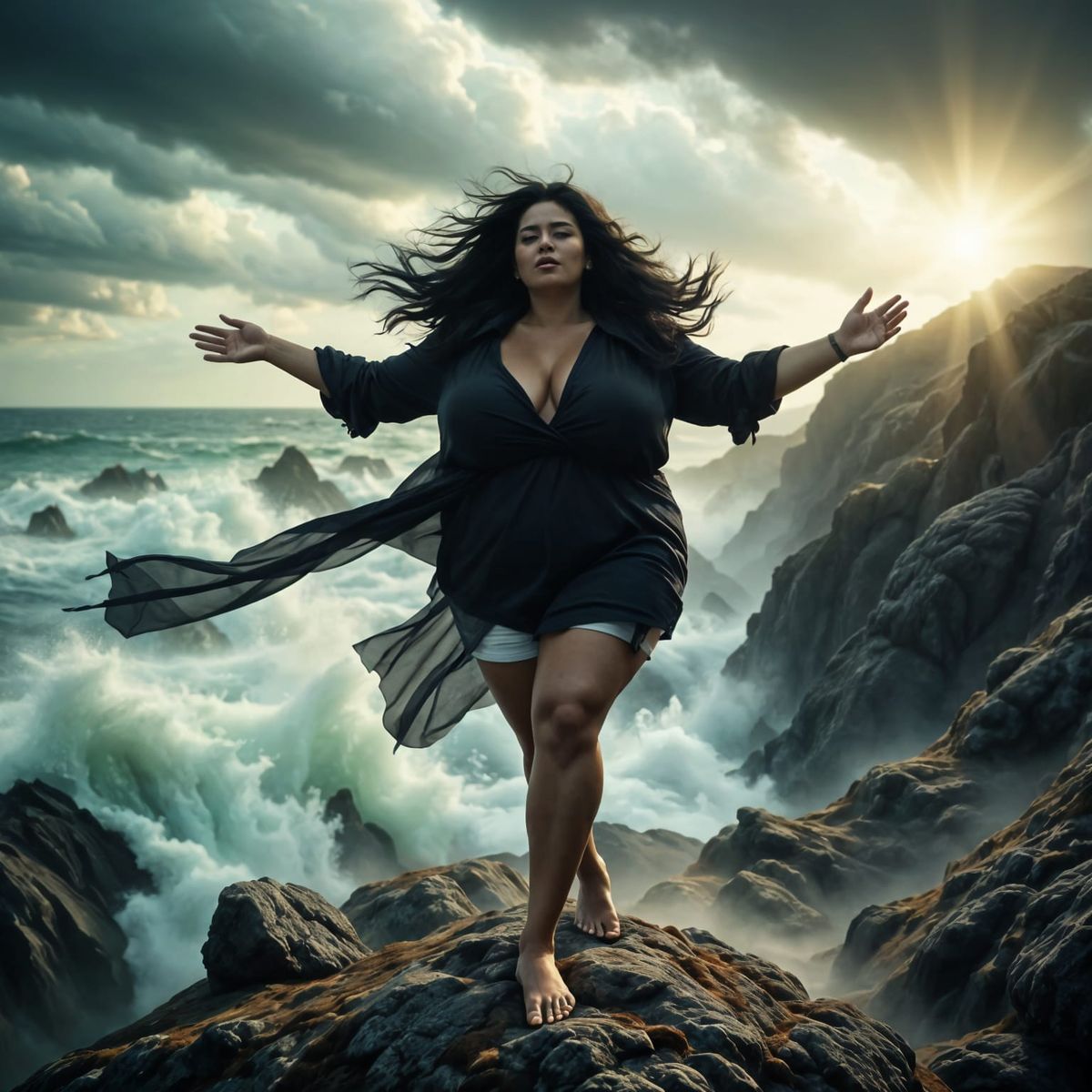 This image captures a dramatic moment of a woman standing on a cliff, arms raised to the sky, as a storm approaches. The hyperrealistic style and cinematic lighting create a sense of tension and awe.