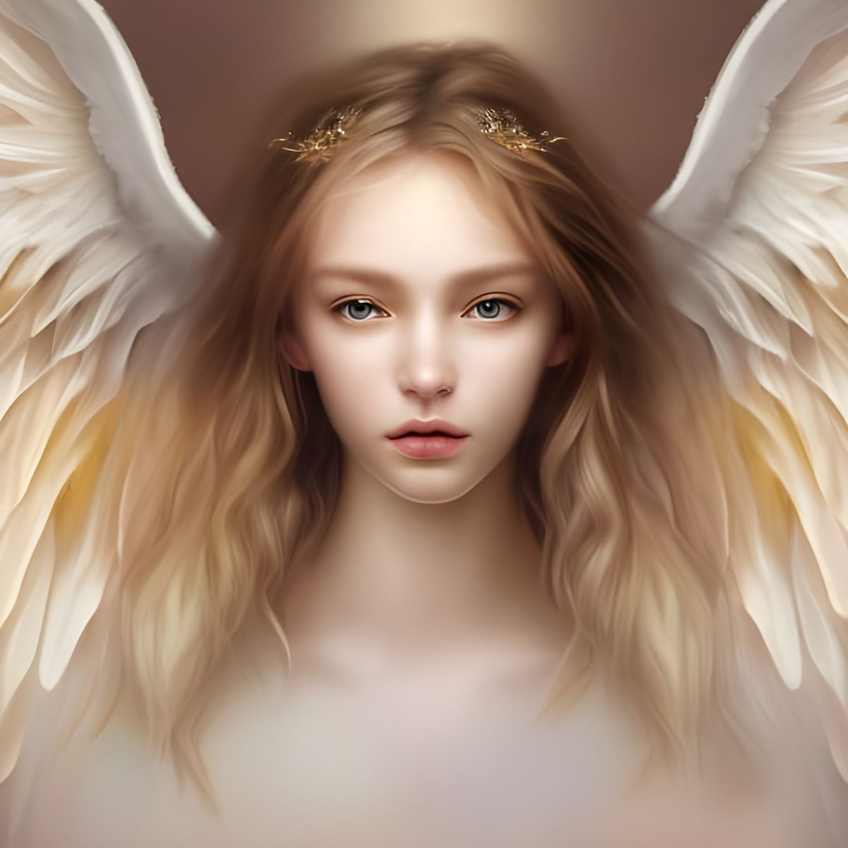 This image shows a beautiful seraphim angel with a detailed, innocent face. The angel is depicted in white clothing with gold trim, rendered in an elegant, hyperrealistic style.