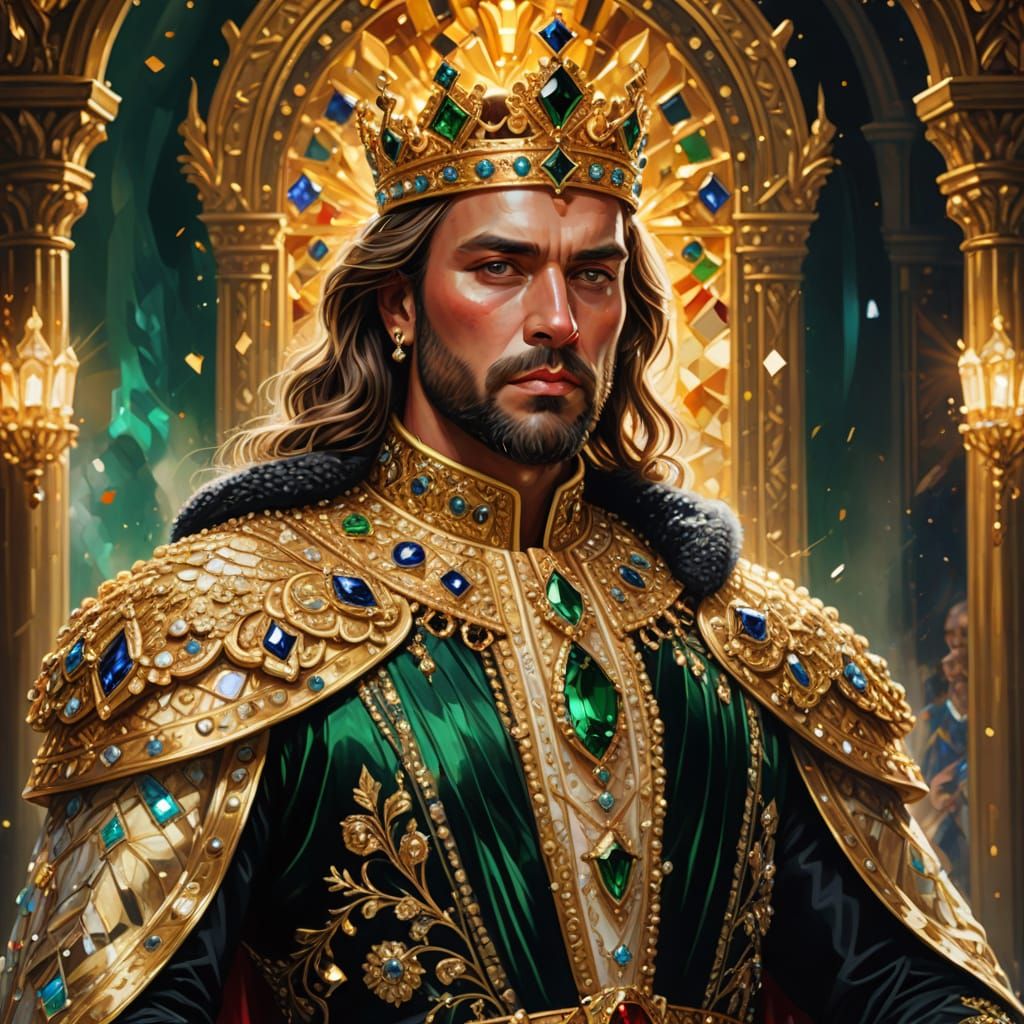 This stunning image showcases a king wearing a golden, majestic dress adorned with sparkling white and black diamonds, rubies, emeralds, and sapphires, set against a backdrop of vibrant oil painting colors and intricate fabrics.