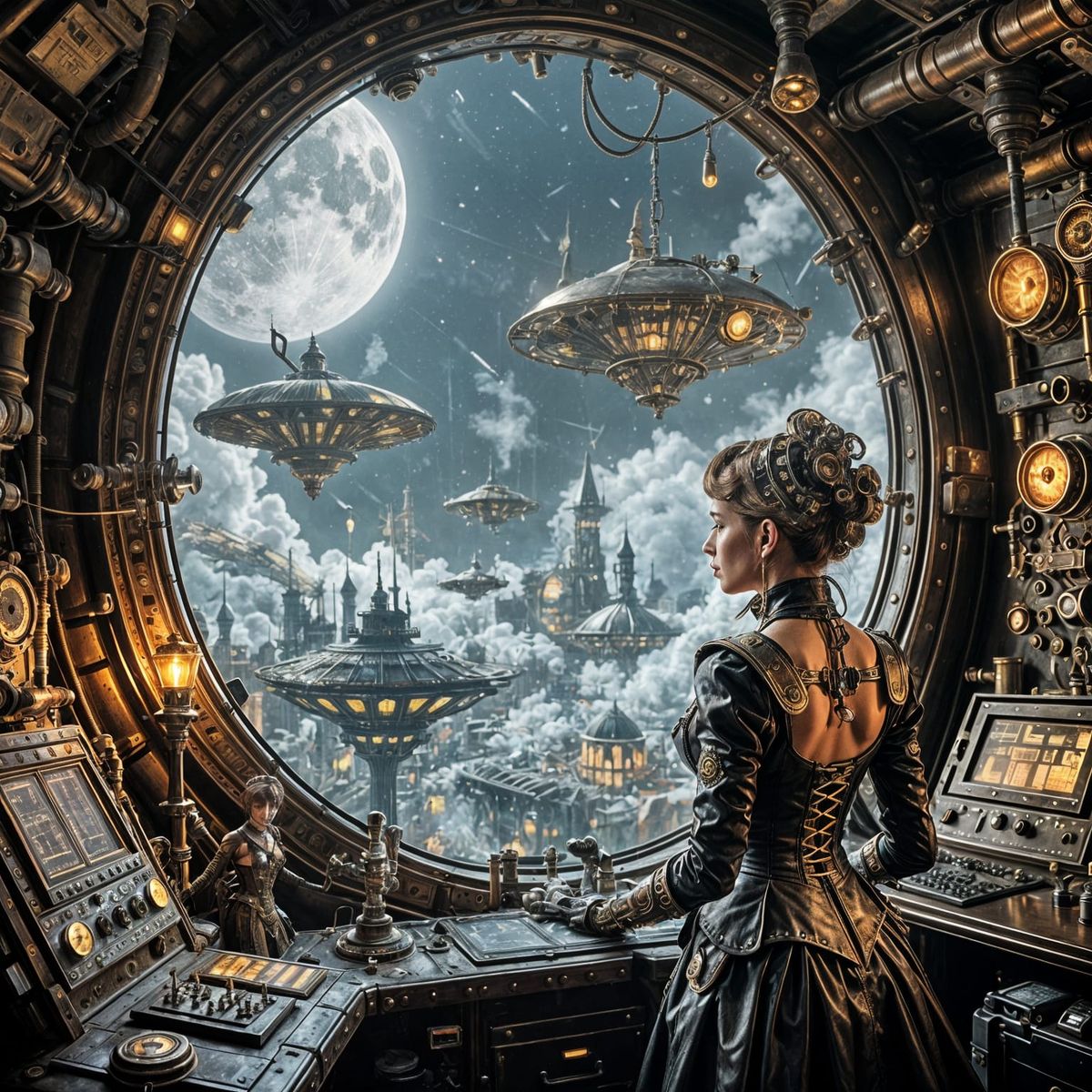 A beautiful woman in Victorian steampunk attire observes a sprawling moon base from a vast control room filled with intricate machinery and glowing gauges.