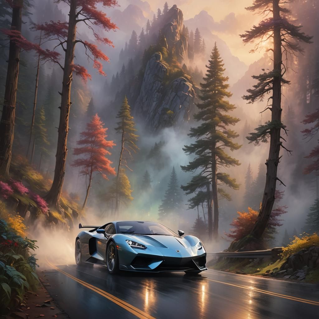 A hyperrealistic image of a supercar driving on a misty mountain road. Warm lighting and soft focus add to the cinematic and mysterious atmosphere in a Thomas Kinkade style.