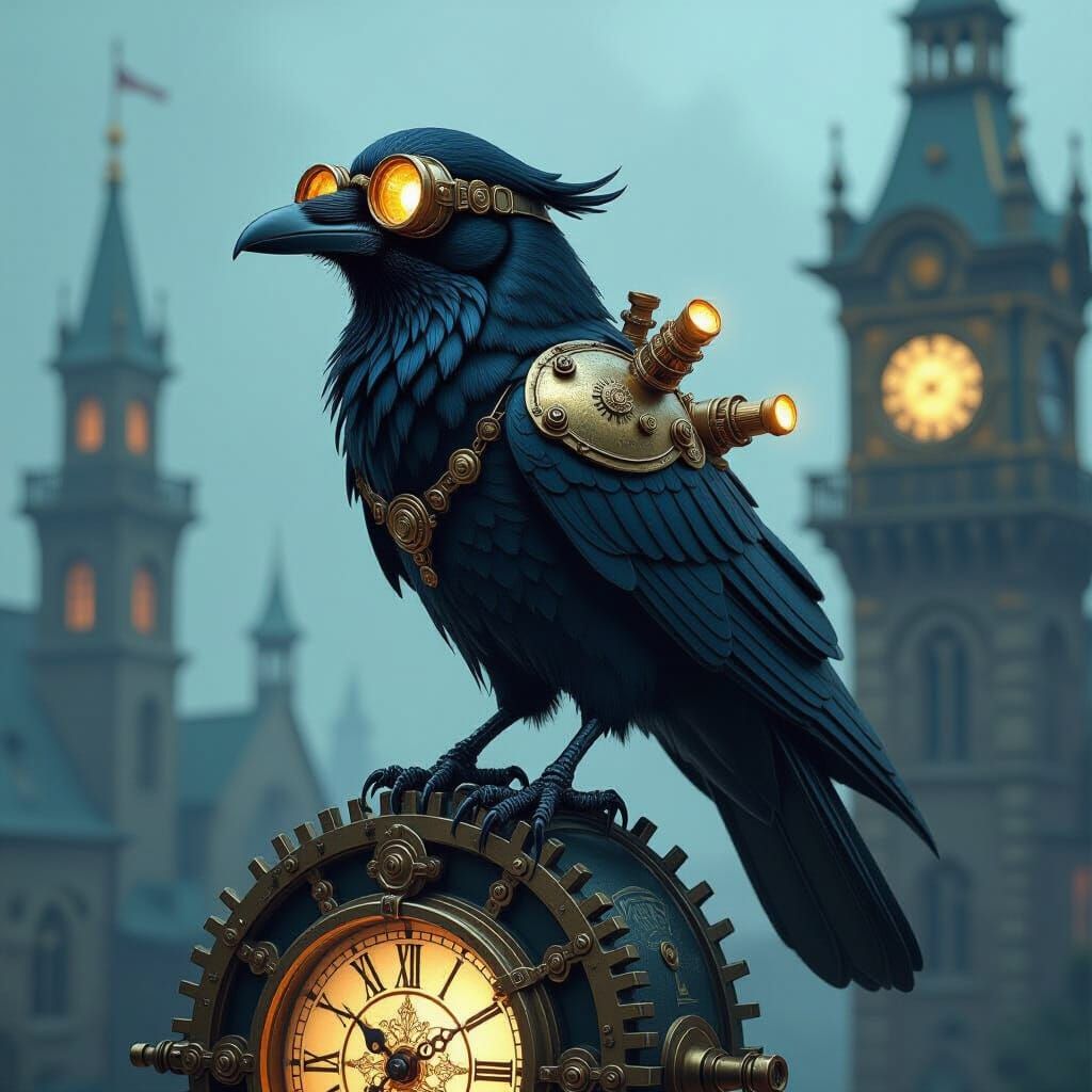 A steampunk raven, adorned with tiny mechanical goggles and intricate brass armor, perches majestically on a gear-covered clock tower. Glowing steam tubes vent softly, illuminating the detailed metal feathers. The scene is rendered with ultra-detailed precision and crisp lighting, evoking a whimsical ...