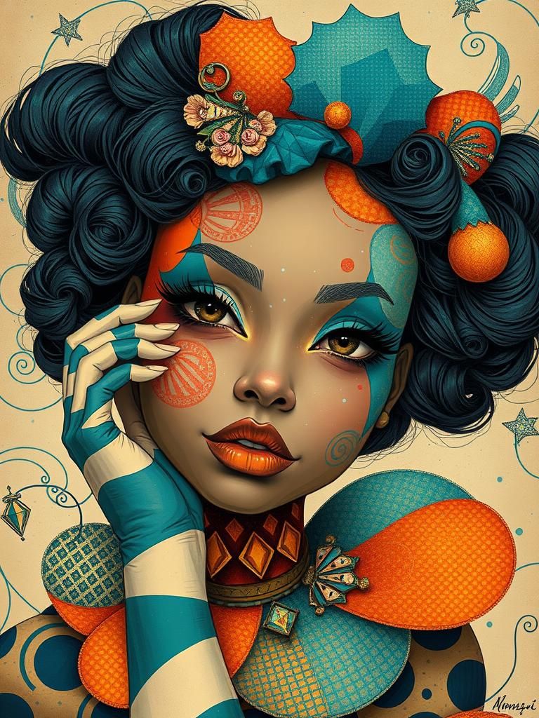 This image shows a vibrant African American jester woman in a colorful costume against a surreal background. The artwork features bold outlines, vivid colors, and a pop surrealism aesthetic.
