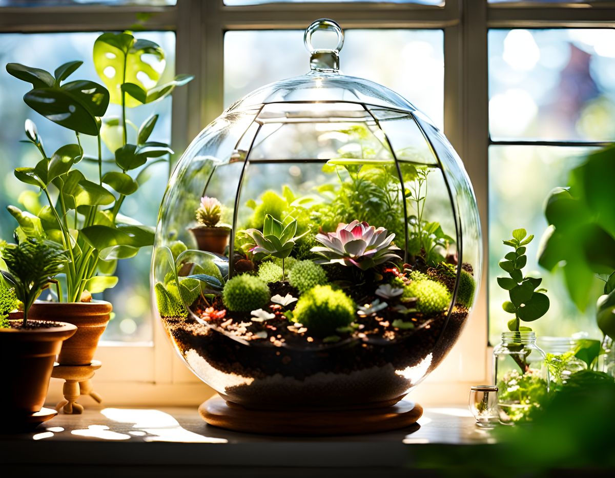 This image showcases a lush terrarium bathed in warm, sunny backlighting. The vibrant greenery creates a miniature world of natural beauty.