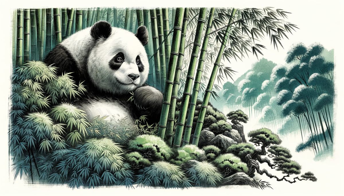 A serene image of a panda bear resting among lush green bamboo. The artwork evokes traditional Chinese ink wash painting with dry brush techniques and reflects ancient artistic sensibilities.