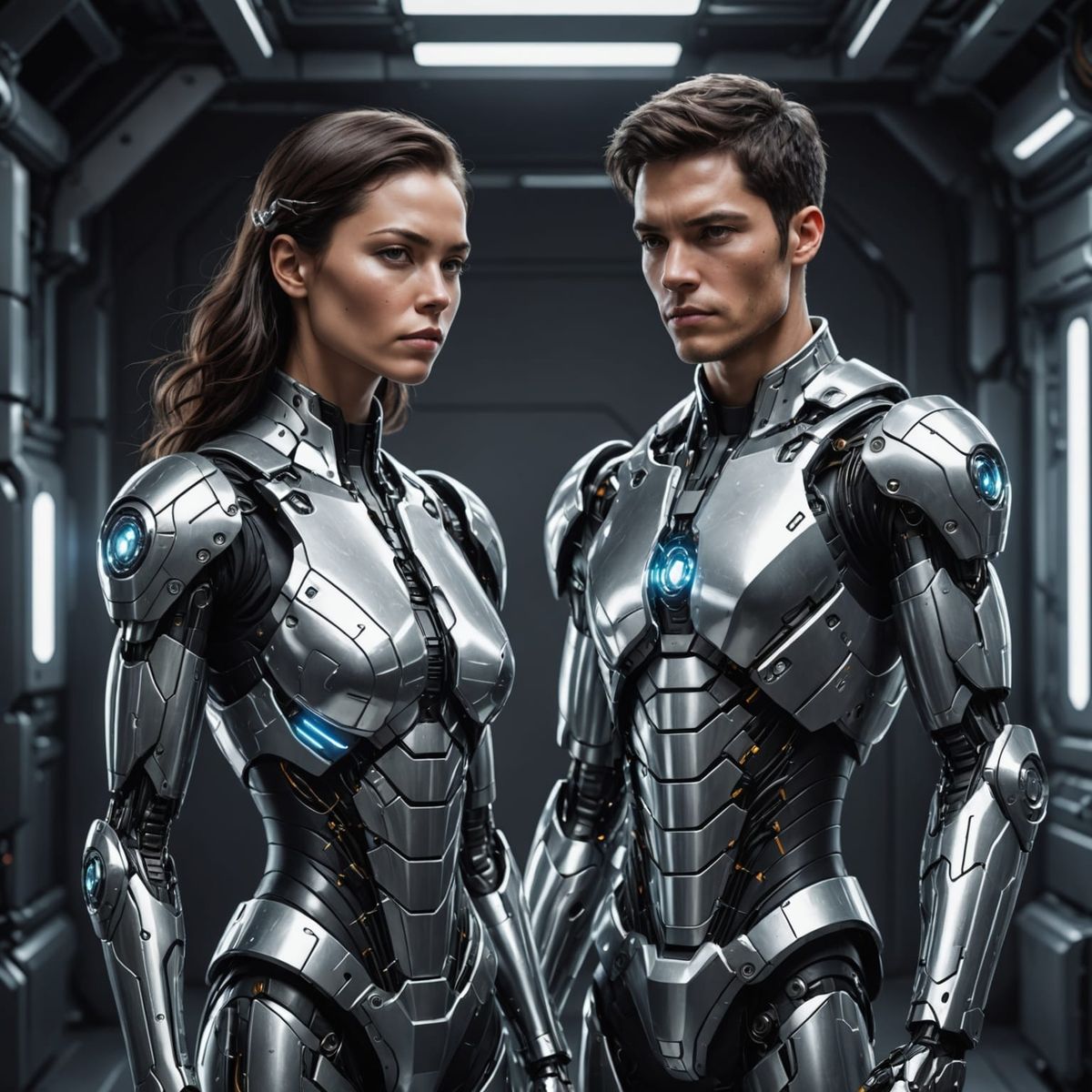 A striking picture of two cyborgs holding hands and sharing a rose. This 8K image captures the intricate metallic details of the couple in a minimalist environment with warm lighting.