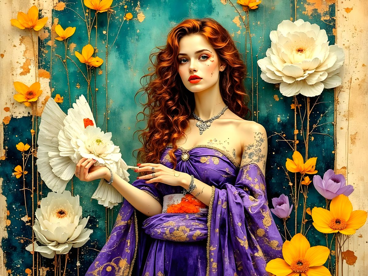 A striking picture of a hippie woman in a purple kimono dress holding a sea eagle and fan. The image blends art nouveau curves with a vibrant color scheme in an ethereal style.