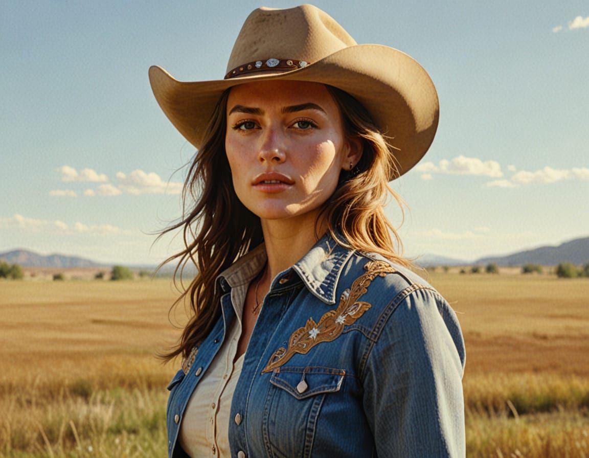 A majestic cowgirl stands tall in a sun-kissed field, her face bathed in warm golden light, with soft brushstrokes on her clothing and vibrant colors in a stunning oil painting