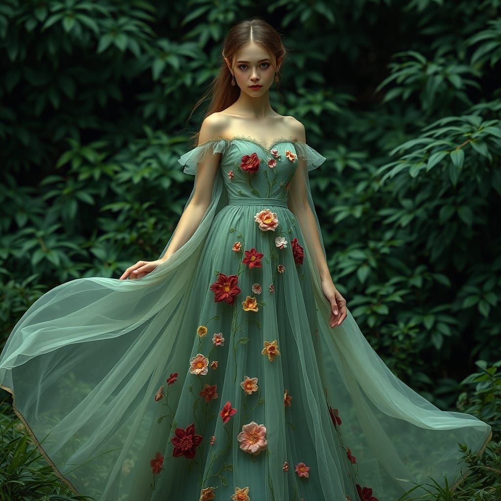 A young woman in a flowing, nature-inspired dress with embroidered flowers and petals, posing serene, set against a lush green backdrop of foliage, in a detailed, matte-painted scene with deep colors, intricate details, and complementary hues, evoking fantasy concept art, reminiscent of Simon Stalenhag, ...