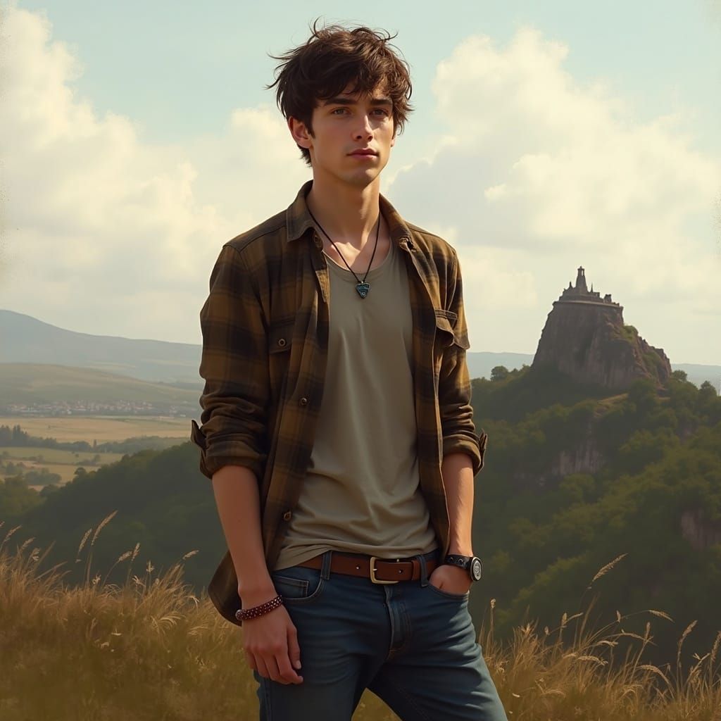 This image shows a young Irish man with tousled hair and a thoughtful expression, standing near Arthur's Seat. Rendered in a painterly style with warm earth tones.