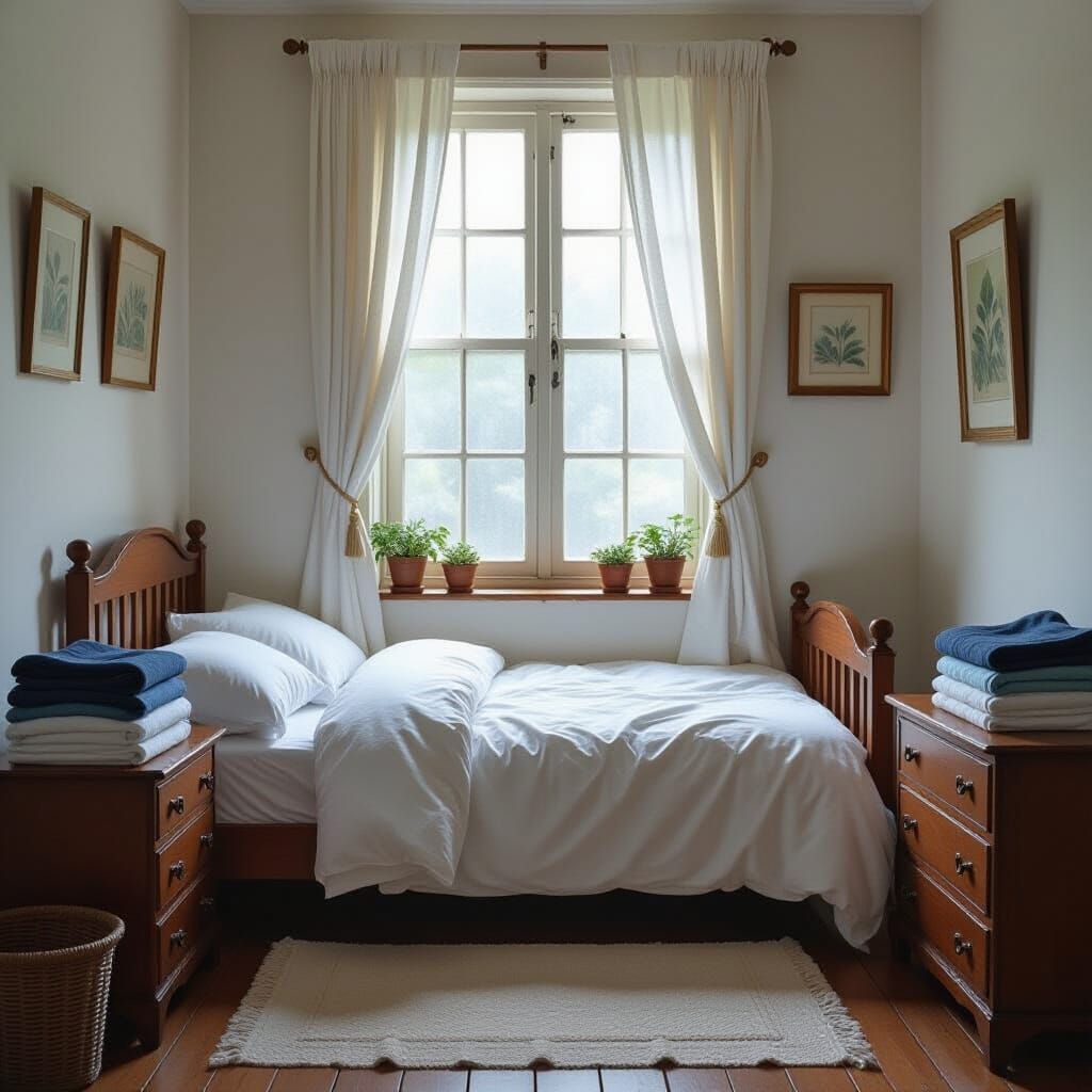This image shows a serene chamber with neatly folded clothes, an untouched bed, and soft light streaming through rain-soaked windows. The artwork is reminiscent of delicate line art and muted watercolor illustrations.