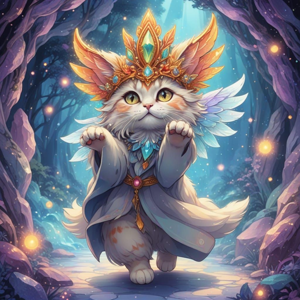 A vibrant manga-style image of a winged cat in an elaborate crystal headdress. The feline dances amidst psychedelic patterns with shimmering, iridescent wings and soft, ethereal lighting in pastel colors.