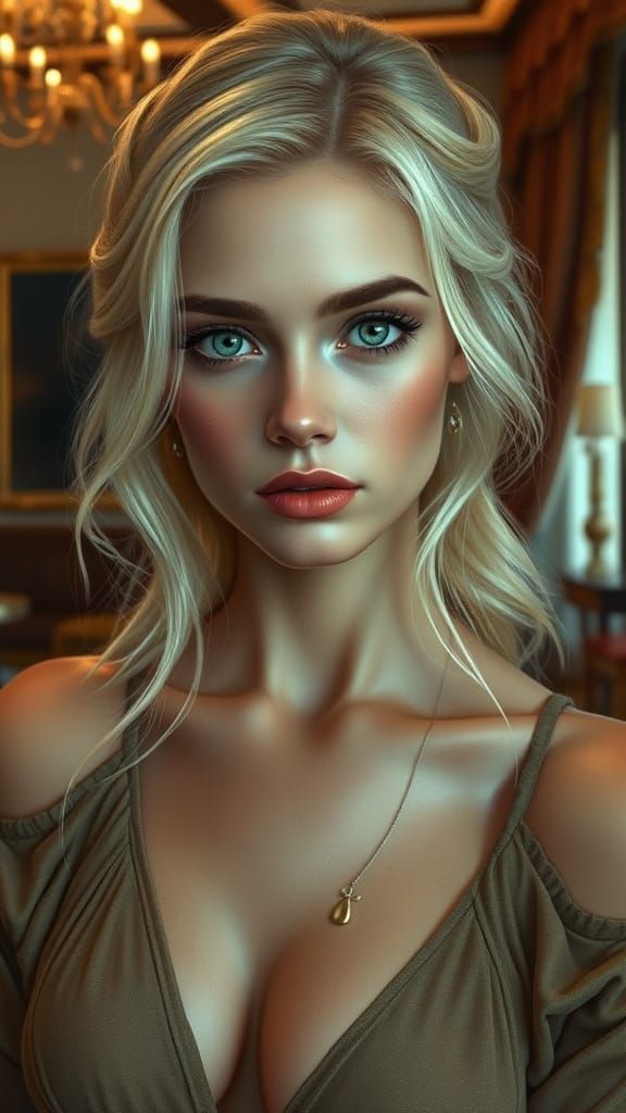 A striking picture of a beautiful blonde woman with sensual features, elegantly dressed and posed. The image is rendered with intricate detail and soft lighting in a realistic style.