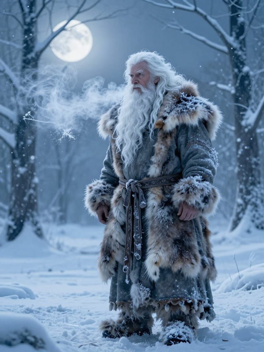 This image depicts Zimnik, the ancient Slavic frost god, as a white-bearded elder on a frozen field. His icy breath creates frost, with swirling snow and cracked trees. Rendered in a mystical Slavic folklore style with cold, cinematic lighting.