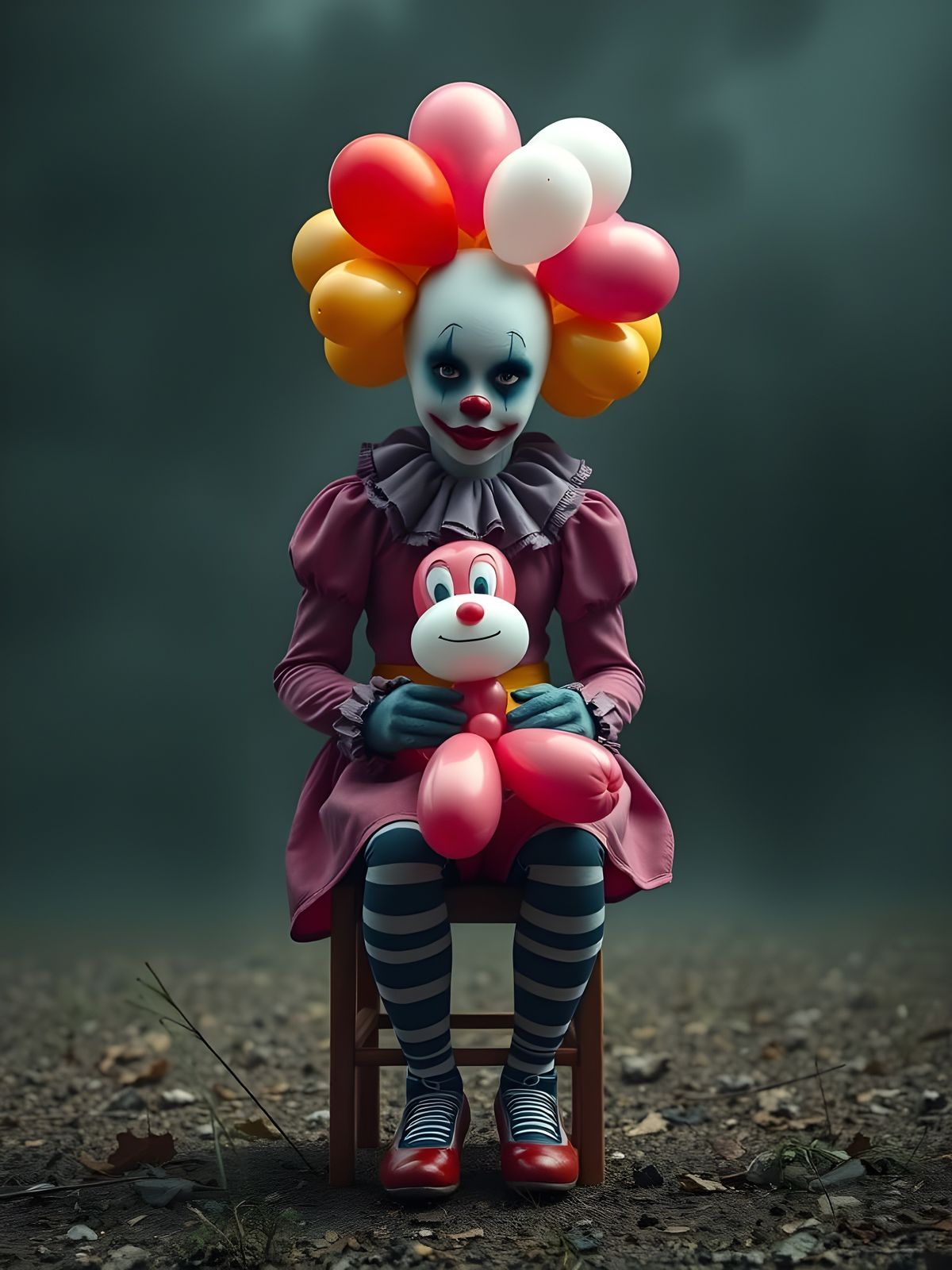 This image shows a sad clown with balloon hair holding a balloon animal. She is sitting on a chair in a dark, depressing scene.