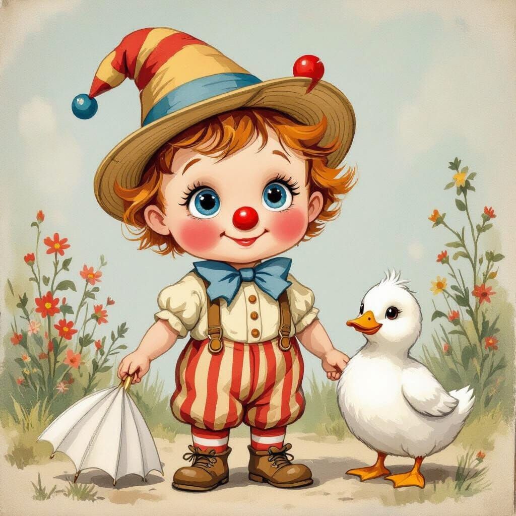 This image shows a vintage-style illustration of a child clown with big blue eyes and rosy cheeks, standing next to a cheerful white duck. The artwork features clean outlines and delicate shading.