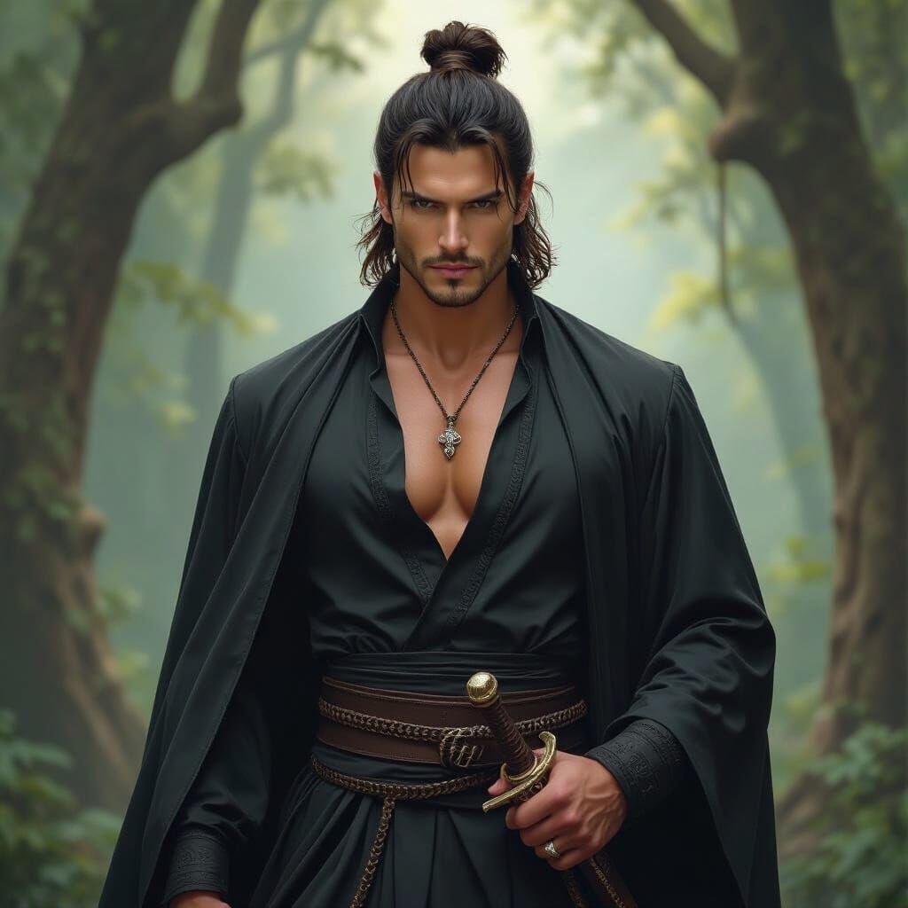 A striking picture of a slender, muscular man in a dark silk suit holding a sword in a dense forest. This image is infused with 18th-century artistic elements with gothic undertones.