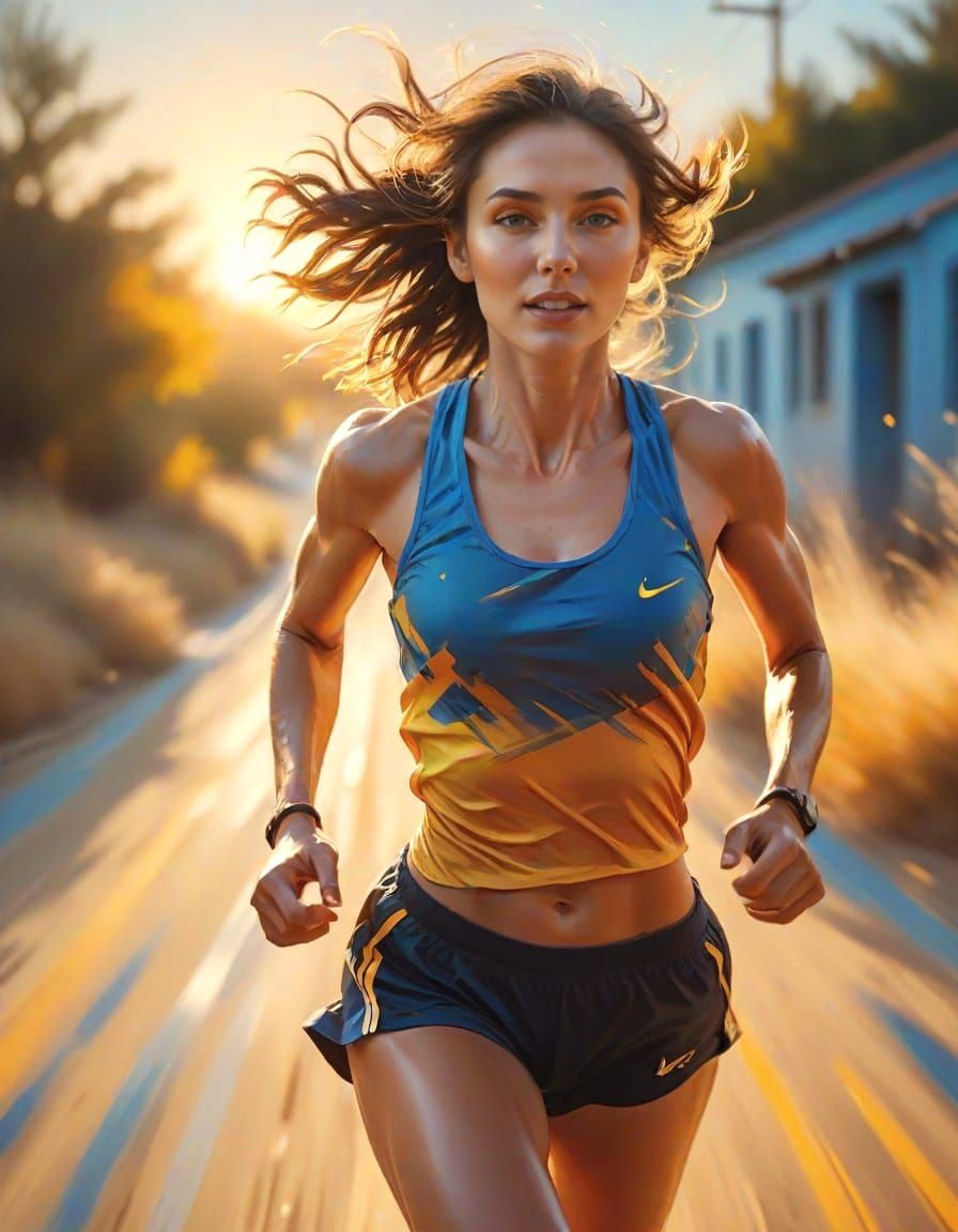 This image showcases a dynamic portrait of a woman, using vibrant orange and deep blue motion blur effects to convey movement and energy against a vivid yellow backdrop with a bokeh effect.