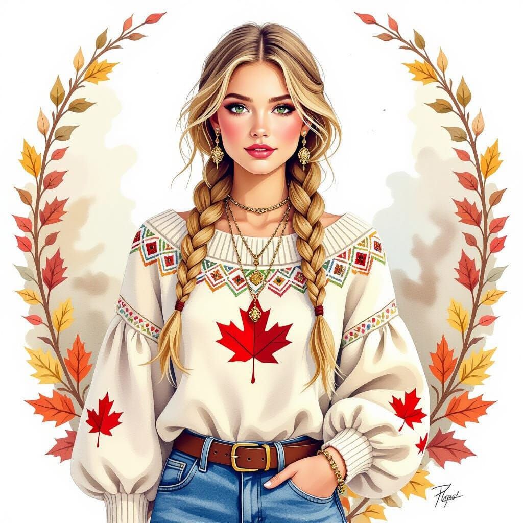 This image showcases a young woman with braided blond hair and a knit sweater, depicted in a vibrant, loose watercolor and digital art style with soft lighting and vivid colors.