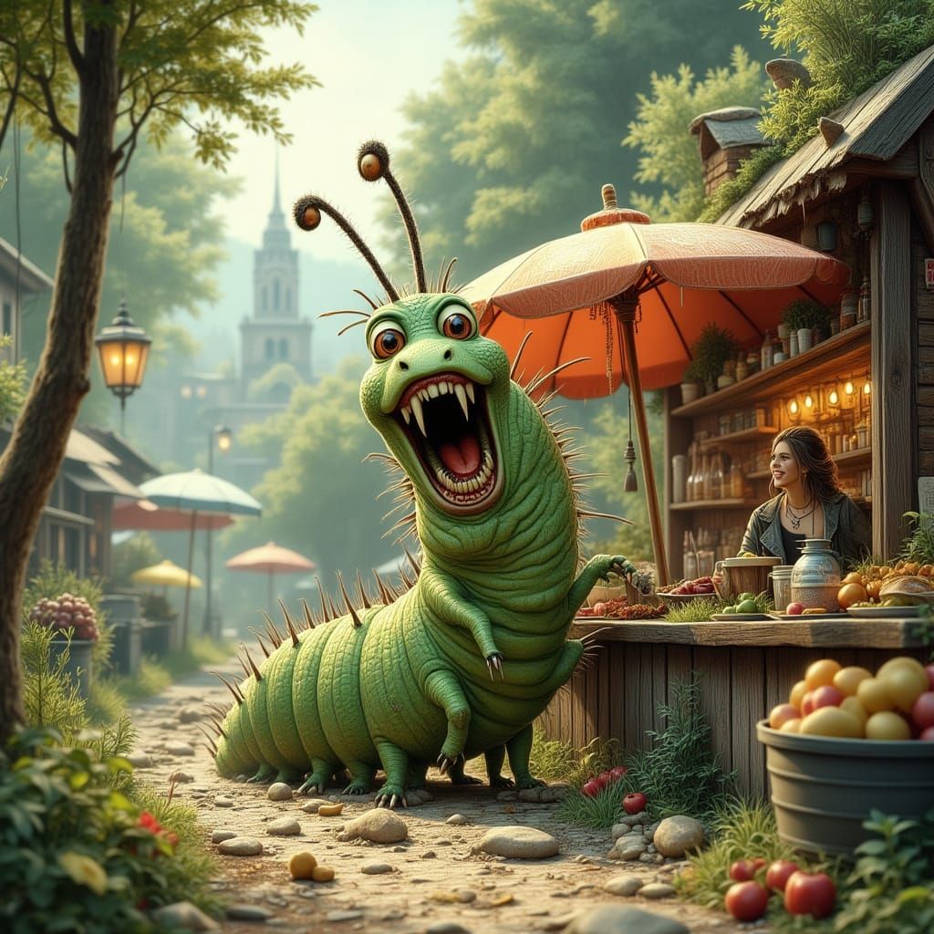 A whimsical image of a caterpillar excitedly choosing food at an outdoor stall. The artwork is rendered in a goth-punk aesthetic.