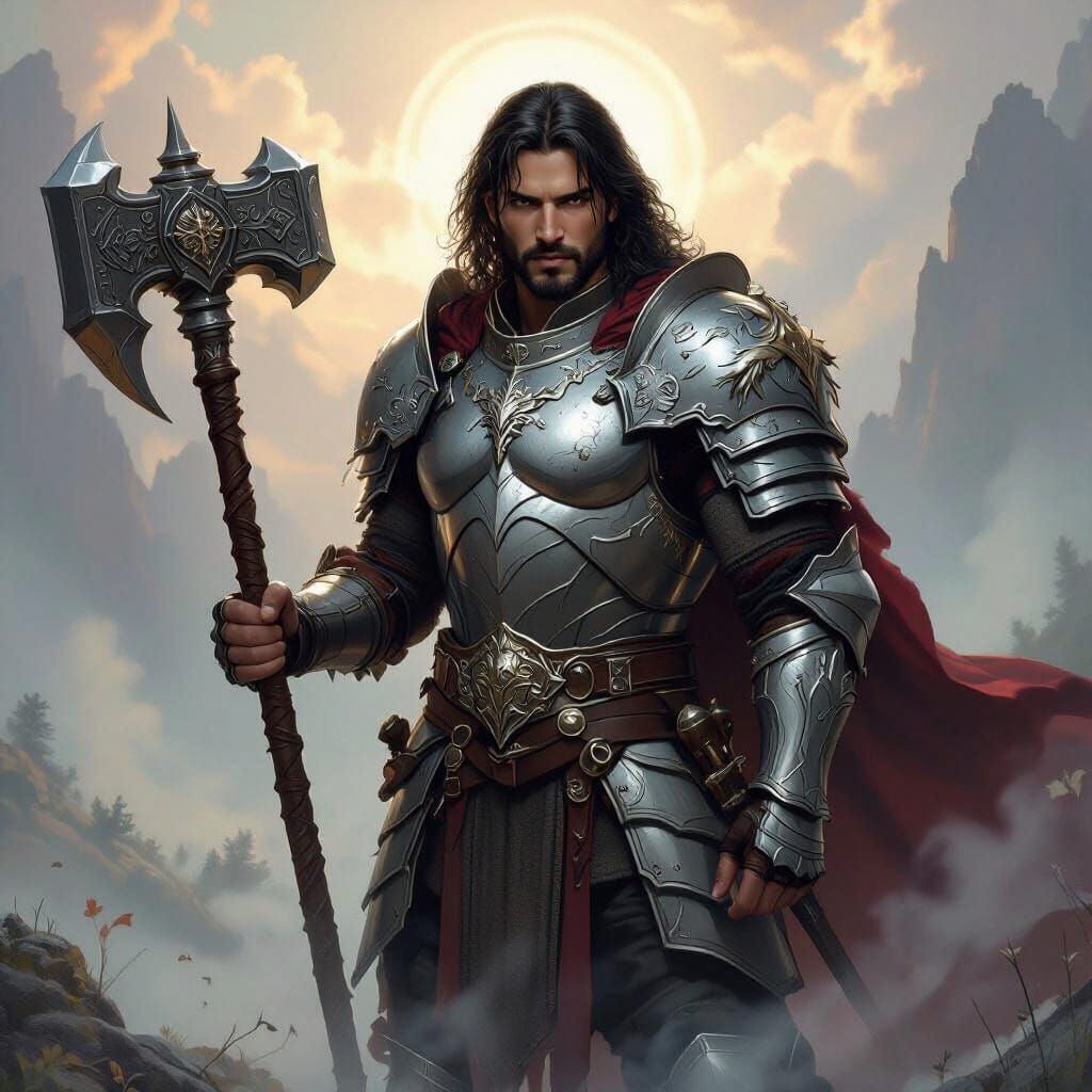 A radiant warrior stands on a misty battlefield, wielding a magical hammer. The scene blends warm landscape elements with dramatic lighting and highly detailed armor.