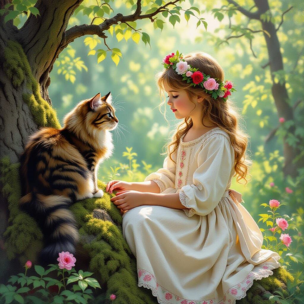 This image shows a young girl in medieval dress adorned with roses exploring a sunlit forest glade, observed by a cat. The scene evokes fairytale fantasy art with intricate details.