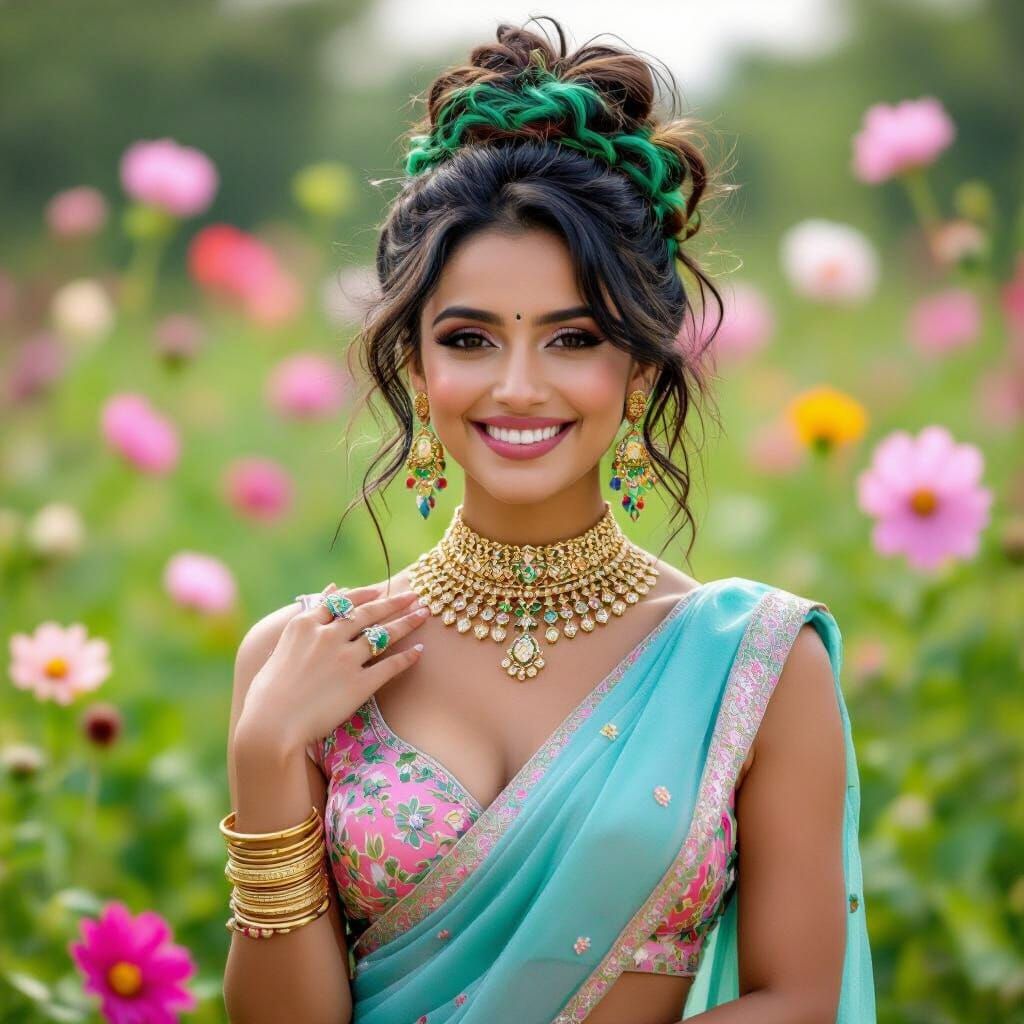 A vibrant portrait of actress Trisha in a cosmos flower park. She has peacock green hair, colourful earrings, and gold jewelry, and wears a pink blouse with a blue saree in a dreamy aesthetic.