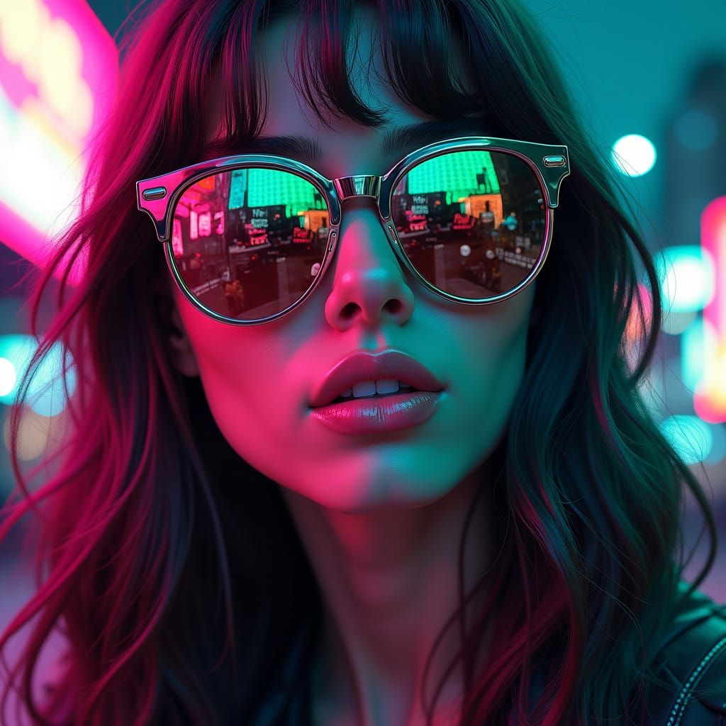 extreme close up face only A vaporwave cyberpunk woman with long wavy hair, wearing a mirrored sunglasses. The color palette is neon green and pink, The background features a neon-lit city street at night,, painting by Jko, hyperrealism | Pixar gloss | polished, Anato Finnstark | Android Jones | Darek ...