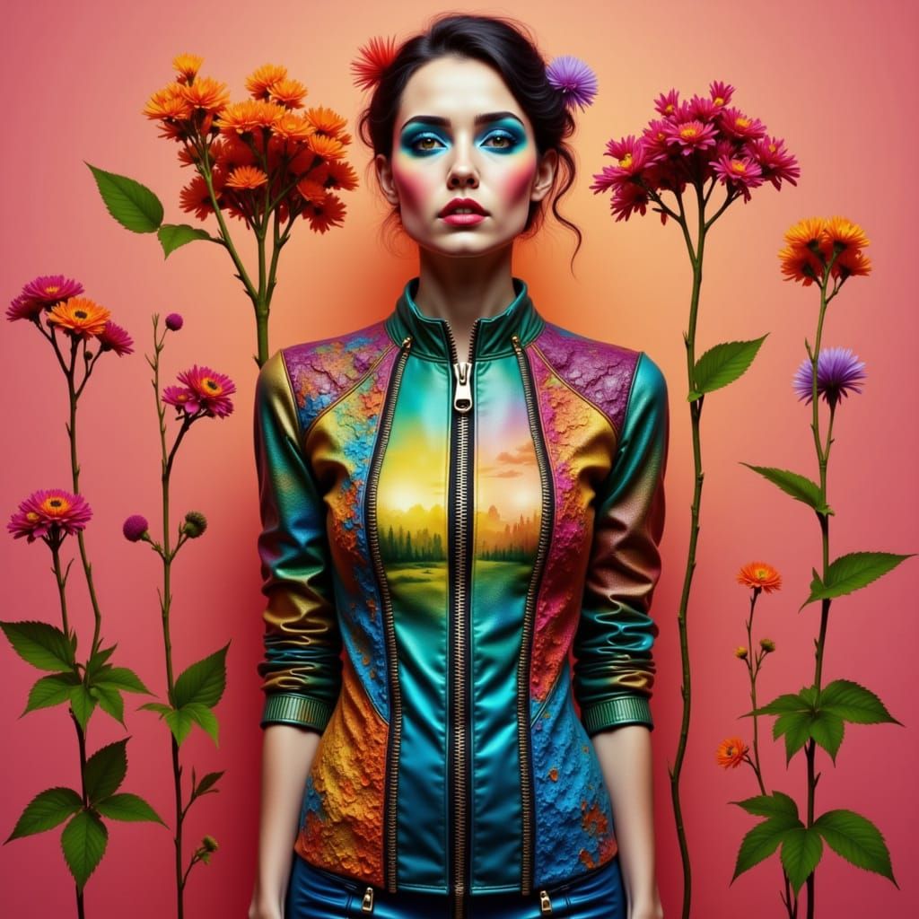 This image shows a woman wearing a vibrant, multi-seasonal outfit with zipper details, in a surreal and intricate digital art style.