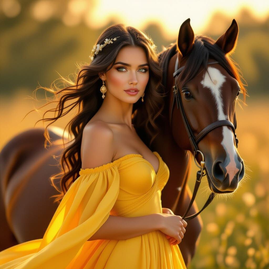A woman embodying summer, in a flowing yellow dress with blonde hair and blue eyes, stands with a horse. The scene features golden light and warm breezes, rendered in a detailed, colorful Pre-Raphaelite style.