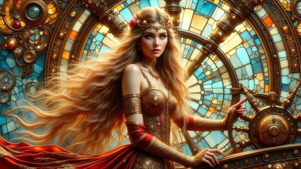 A regal female steampunk captain commands her opulent airship, rendered in a dazzling stained glass mosaic style with metallic textures and shimmering gold accents.