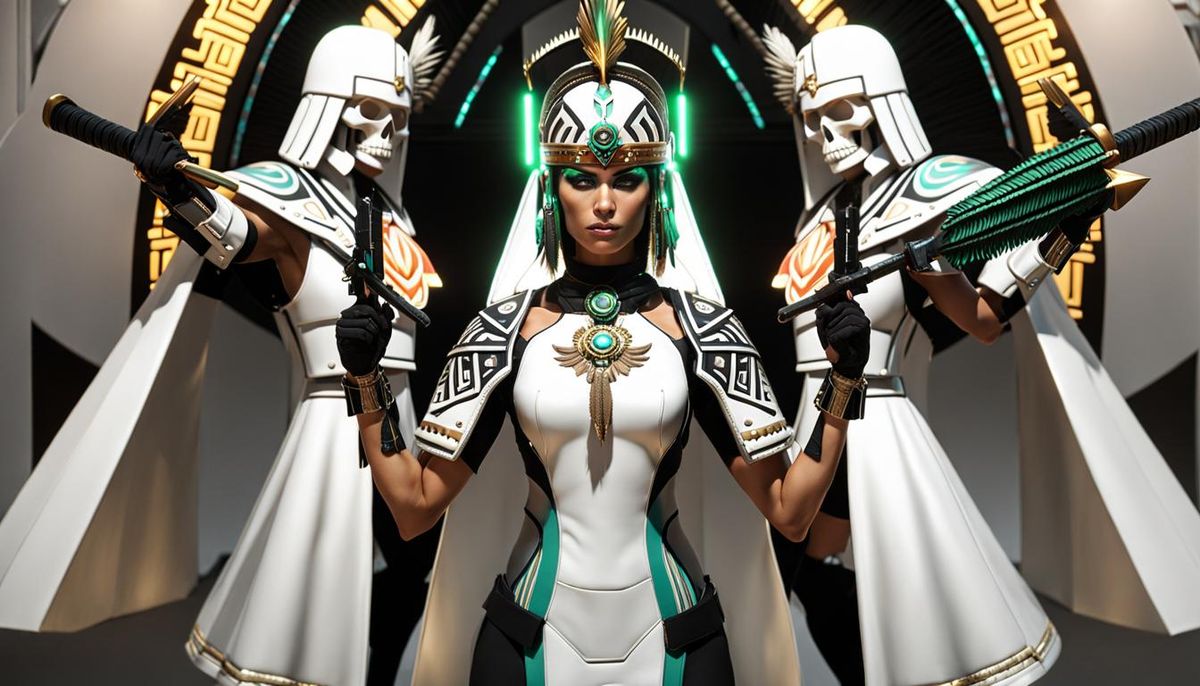 A striking picture of a muscular woman with tanned skin and green eyes, adorned with an Aztec headdress and halo, wielding a flaming sword in combat armor. The image is rendered as futuristic 3D art.