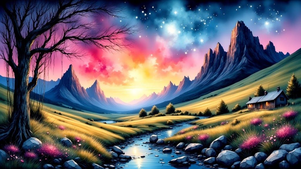 A vibrant, dreamlike landscape bathed in morning sunlight. This artwork blends surreal and abstract elements with colorful Chinese ink lithography and oil painting textures, creating an ethereal atmosphere.