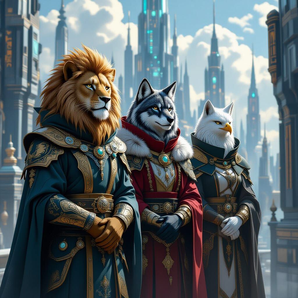 This image shows majestic anthropomorphic beings with lion, wolf, and eagle-like features ruling over a futuristic city. The scene blends fantasy and science fiction elements in a digital art style.