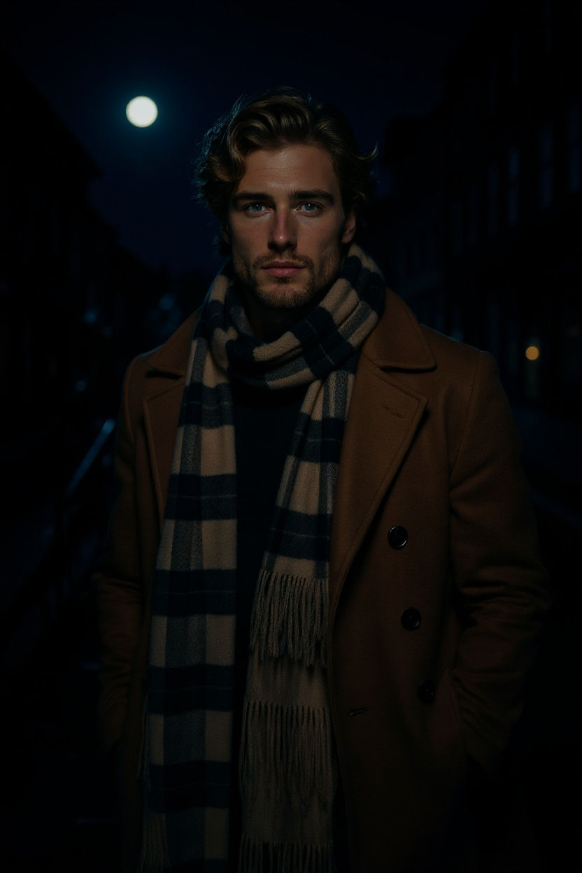 A young, muscular, British with blonde wavy hair, and blue eyes, walks down the streets of London. He is dressed with a cashmere Scottish scarf