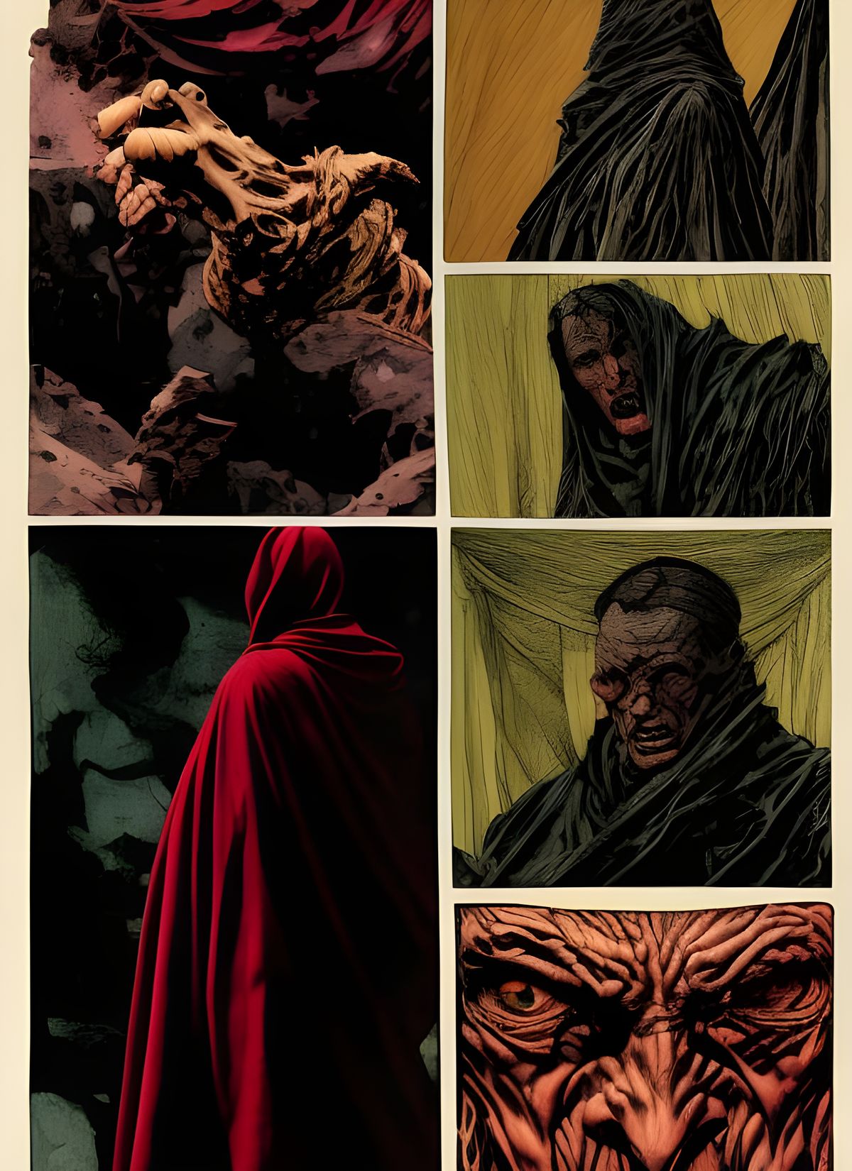 A detailed comic book panel shows a cloaked, ragged figure. This dark god portrait features vibrant hues and a maximalist aesthetic reminiscent of classic comic art.