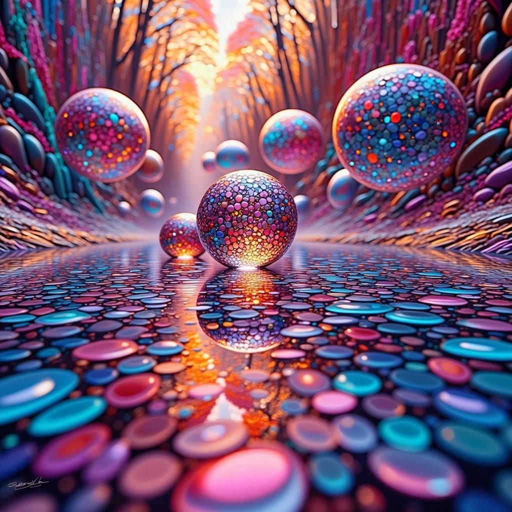 A mesmerizing image of colorful orbs reflected in a maze of curved mirrors, with vibrant highlights and subtle motion blur, reminiscent of high-fidelity surrealism and liquid stained glass effects.