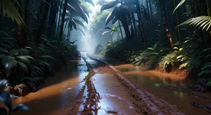 A photorealistic 8k image of a muddy jungle road. The image evokes a scene from an action movie, reminiscent of Fast and the Furious meets Transformers.