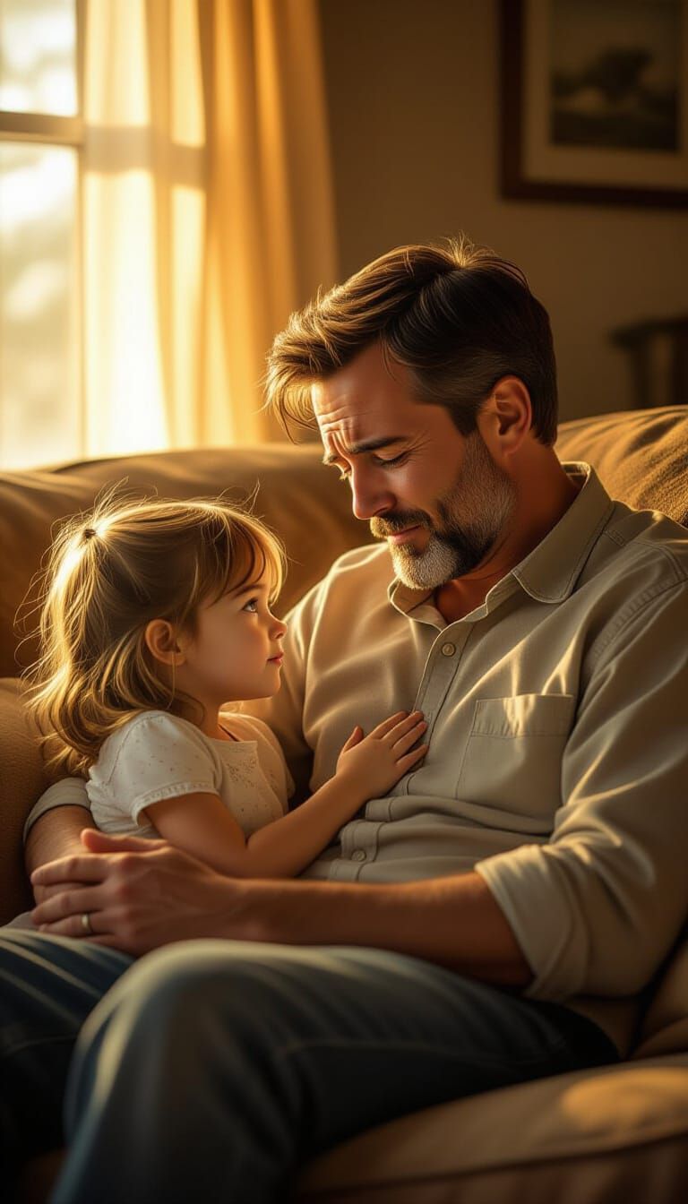 A touching image of a father and daughter sharing an emotional moment on a worn couch. Golden sunlight creates soft shadows, enhancing the realistic, detailed textures in a matte painting style.