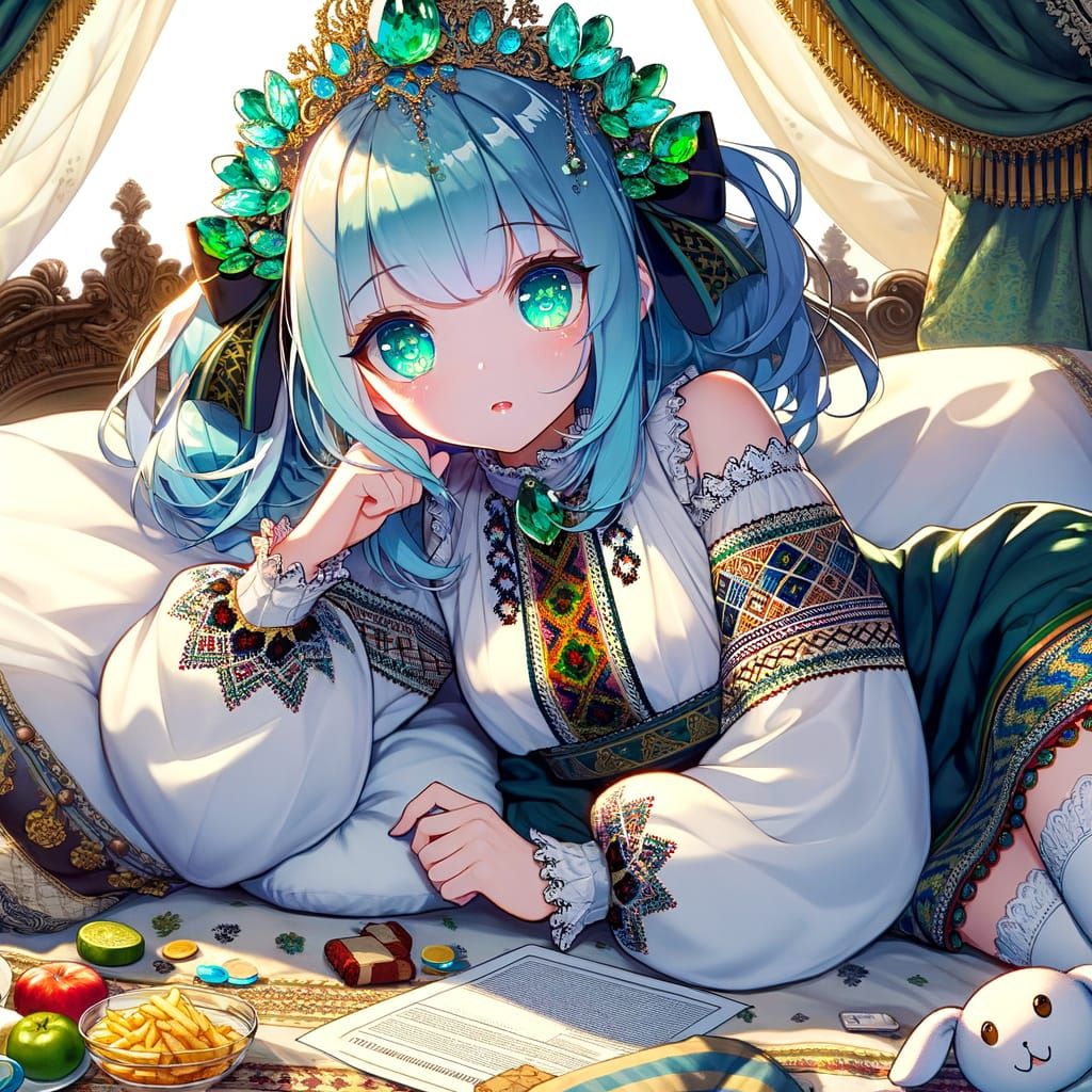 This image features a young girl with blue hair and green eyes wearing a Ukrainian blouse and flower crown. The scene evokes late 19th-century animation styles.