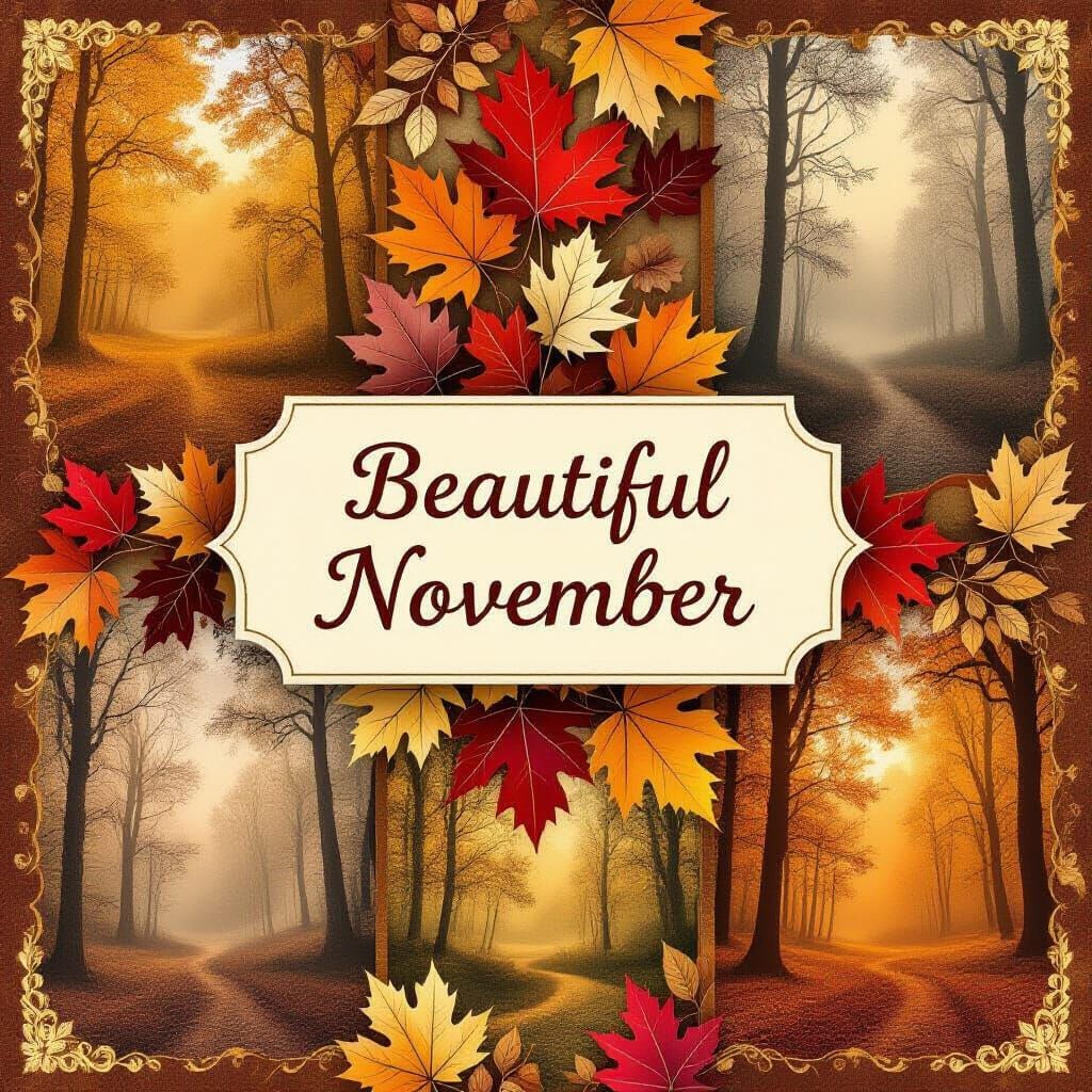 This image showcases a layered mixed-media collage of late autumn scenes, with misty forests, vibrant leaves, and warm, glowing light in earthy tones.
