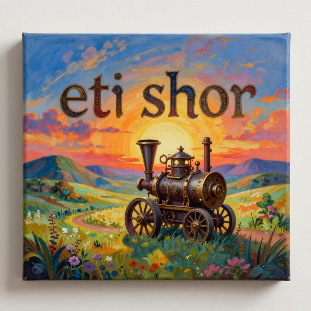 This digital matte painting depicts a whimsical steampunk engine in a vibrant, dreamlike landscape. Rich, warm lighting and painterly textures create a surreal and imaginative atmosphere.