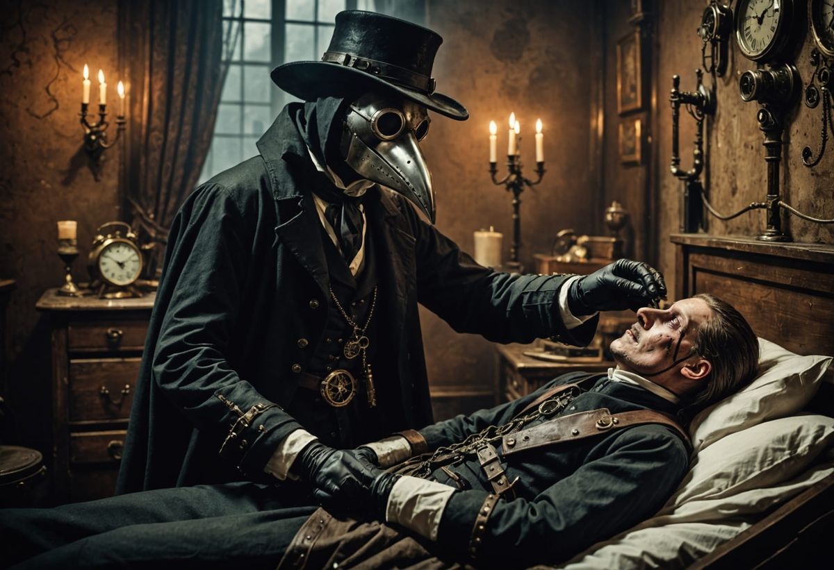 This haunting image shows a steampunk plague doctor attending to a seriously ill patient in a dimly lit, atmospheric steampunk interior, evoking a sense of foreboding and dread.
