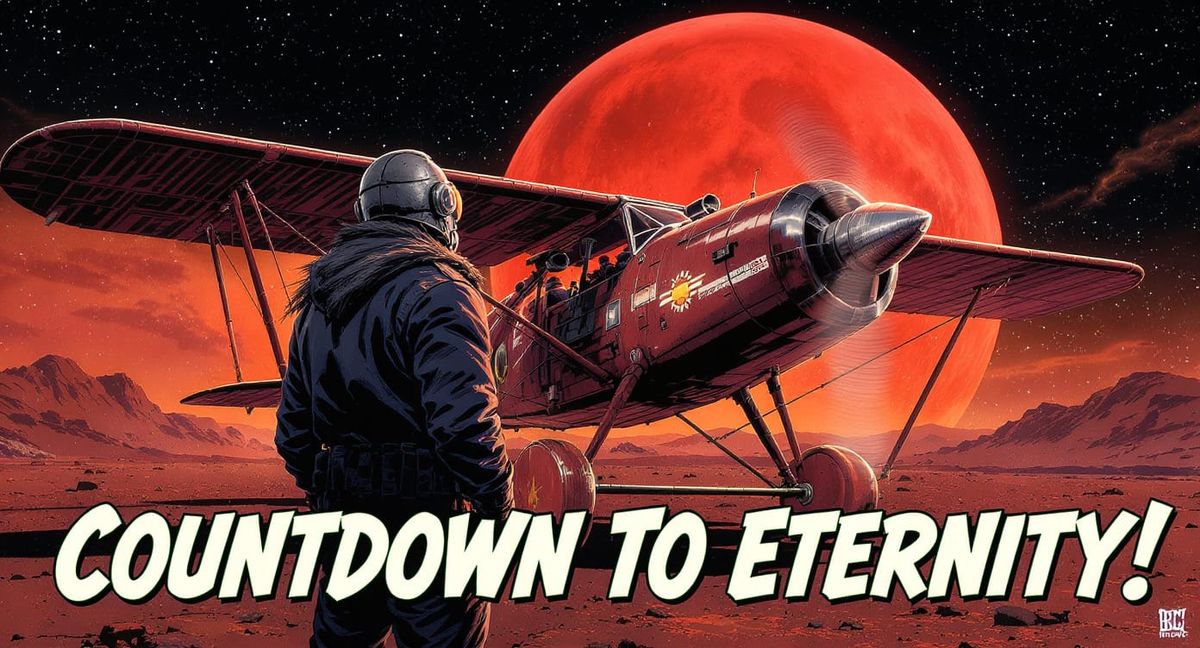 A lone pilot stands beside his rocket-powered biplane, gazing up at the Martian sky. The scene is reminiscent of classic noir comics, with bold lines, stark contrasts, and dynamic action lines. The pilot wears a silver helmet and leather jacket. Across the bottom of the image, in large font, are the ...