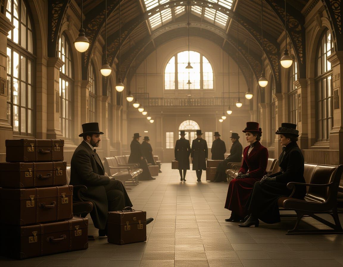 A captivating image of a 19th-century train station waiting room at dusk. The picture showcases strong Eastern-European, steampunk, and retrofuturistic influences in warm sepia tones with film grain.