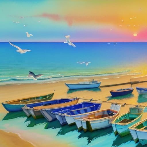 This image captures a tranquil scene of birds soaring above a beach at sunset, with colorful boats anchored in the soft, golden light of the fading day. The impressionist brushstrokes and pastel colors evoke a dreamy, ethereal atmosphere.