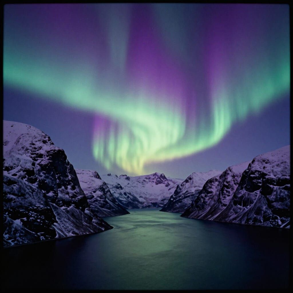 This image captures a majestic winter fjord bathed in the glow of purple and green aurora borealis. Shot in a cinematic style with film grain and atmospheric lighting.